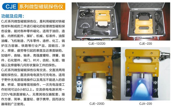 CJE系列微型磁軛探傷儀有交流、直流、交直流兩用磁粉探傷儀,直流供電電源為可充電池,適用于野外無(wú)電源現(xiàn)場(chǎng)操作以及高壓不能進(jìn)入的容器、橋梁、管道等現(xiàn)場(chǎng)操作,一次充電連續(xù)工作時(shí)間可達(dá)6小時(shí)以上。交流供電電源采用220V電源直接輸入,無(wú)需其他儀器配套,操作方便、簡(jiǎn)單、重量輕、便于攜帶,因而該儀器得到廣泛使用。